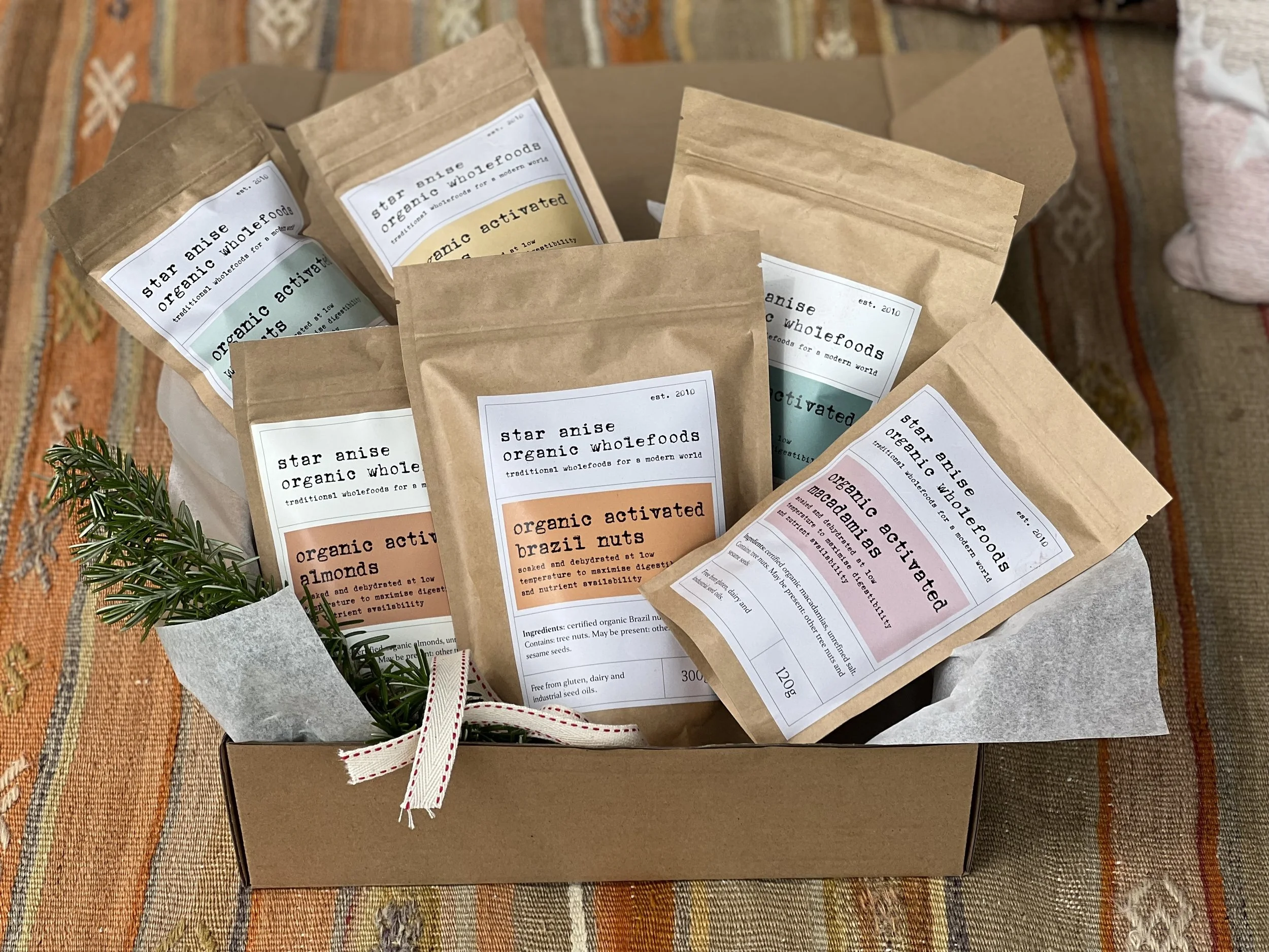 Otherwise we can organise a hamper box containing a selection of activated nuts, chocolate, power bars, olive oil, body butters, and other delicious items that are nourishing and will also be well received. Check these out for some ideas: