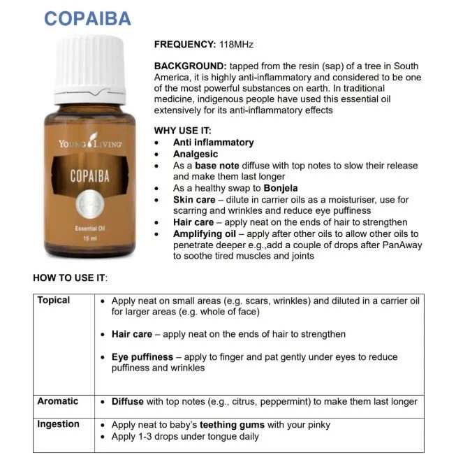 Here is a summary of copaiba oil (found in the Essential Oil 101 Guide in the password-protected Member Resources page of my website):