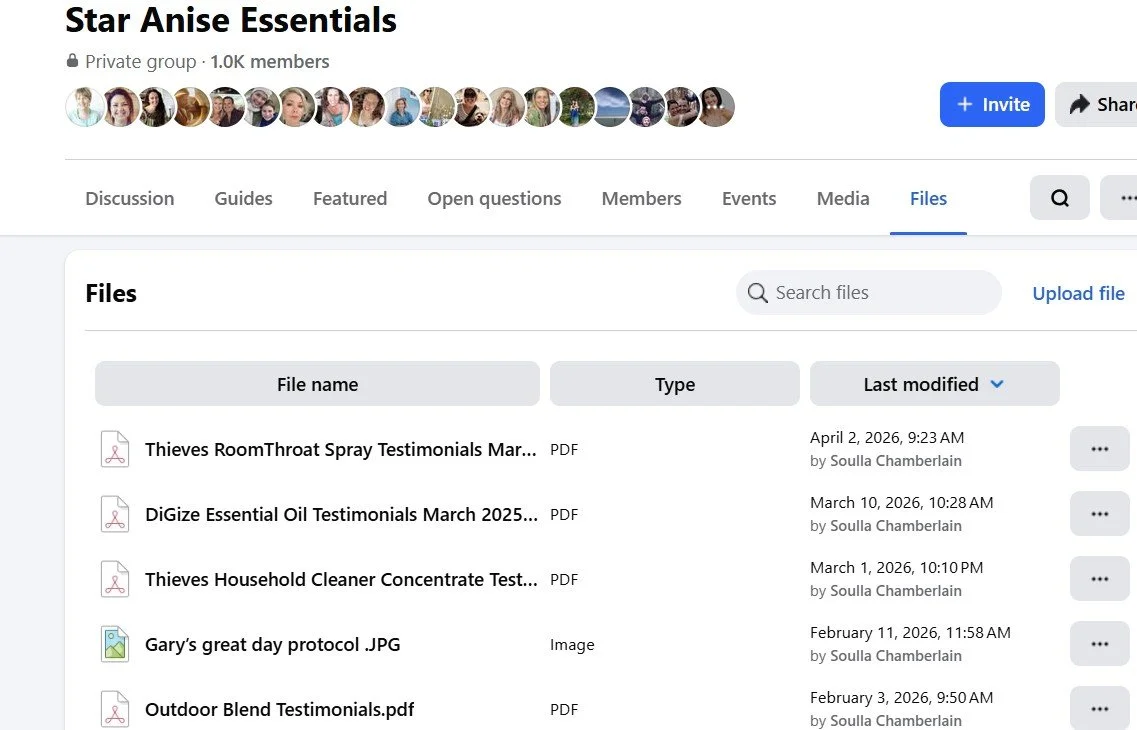 We have saved a copy of these testimonials in the “files” section at the very top of the closed Star Anise Essentials FB page.