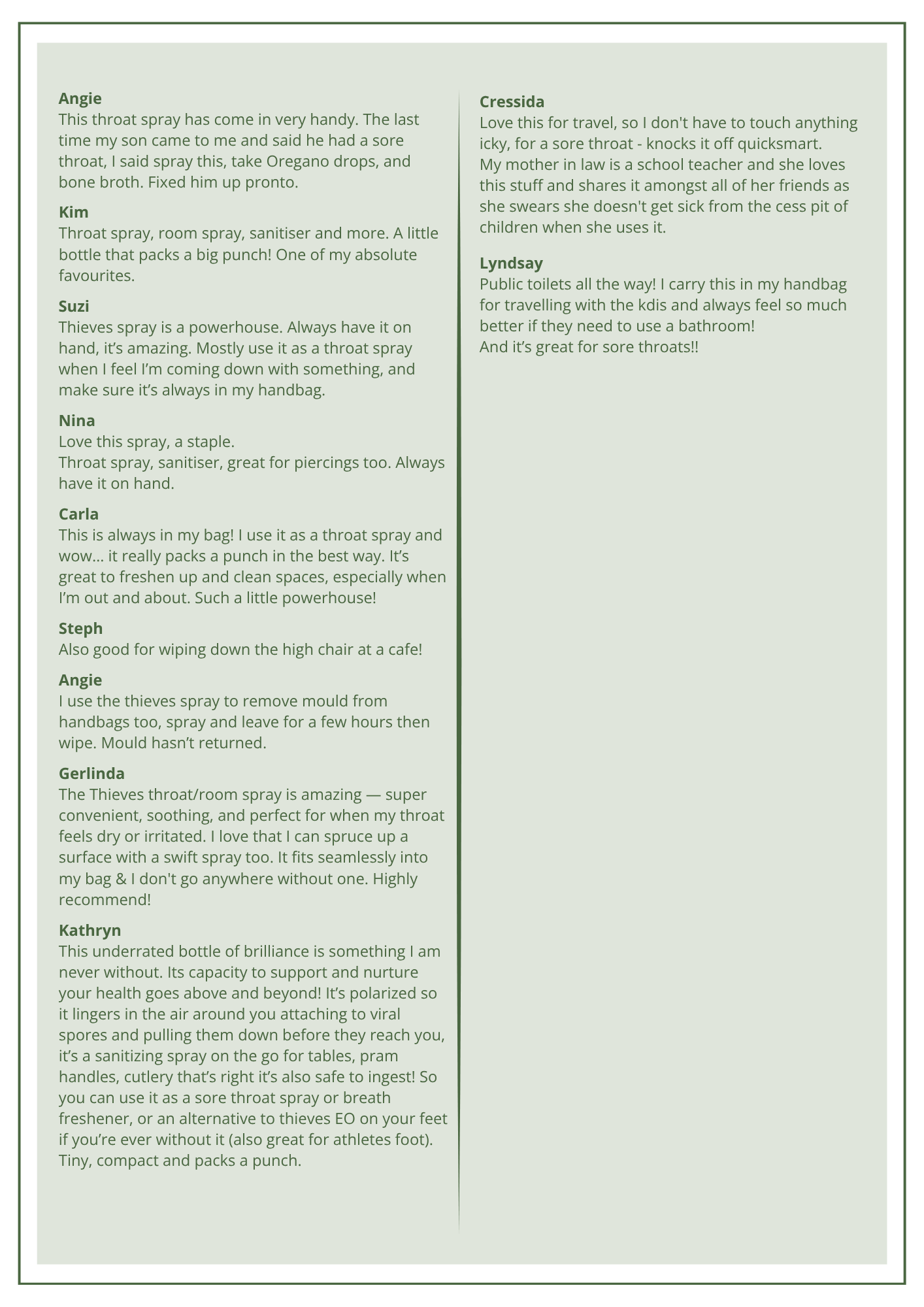 I love how one member uses it to clean earrings and other jewellery, another ear piercings, another to clean computer equipment, another to clean public door handles and high chairs at cafes, another on bed linen, another as a toilet freshener, as a hand sanitiser, and so much more.